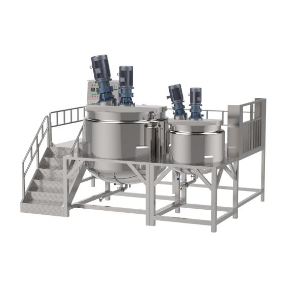 The vacuum homogenizing emulsifier is equipped with a tilting vacuum mixer homogenizer, which is perfect for mixing high-viscosity materials. The mixer works by agitating the ingredients at high speeds, creating shear forces that break down the particles, resulting in a smooth and uniform mixture.